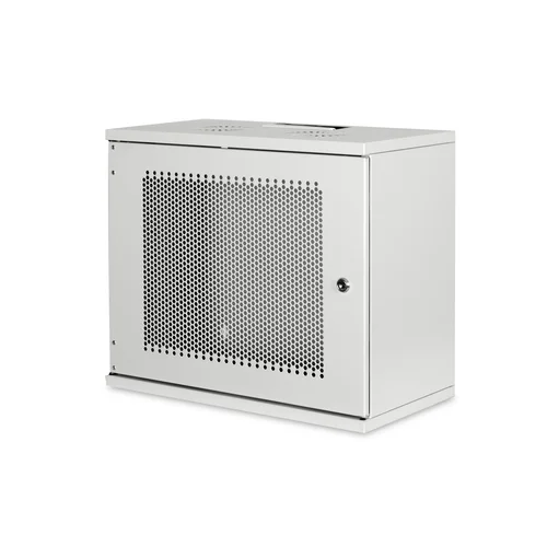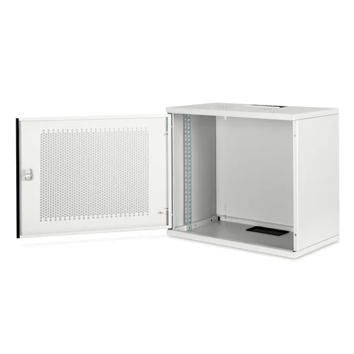 The DIGITUS® Wall Mounting Cabinets are made for high demand IT-Infrastructure Solutions - designed and developed on highest standard in Germany- Unmounted flat package delivery for cost- and space effciency- Optimized air ventilation and exhaustion- Lockable perforated steel front door ensures safetyThe 483 mm (19”) network cabinets for wall installation from the SOHO series are delivered unassembled using a flat pack to optimize costs. Available in four rack units and equipped with a full glass door as well as a cable entry with brushes in the roof and floor, this is the perfect product for subdividing or building up a small to medium-sized network. Two pairs of galvanized 483 mm (19”) profile rails labeled with easy-to-read rack units are installed on the inside. Their depth can be adjusted. Each cabinet is made of up to 1.5 mm thick sheet steel. Coloring is done with electrostatic powder coating in the standard colors gray (RAL 7035) or jet black (RAL 9005). The door hinges can be switched. Installation takes just a few steps and is extremely easy thanks to the step-by-step instructions included.