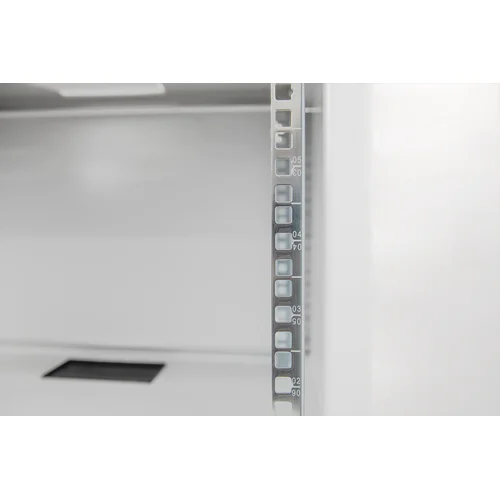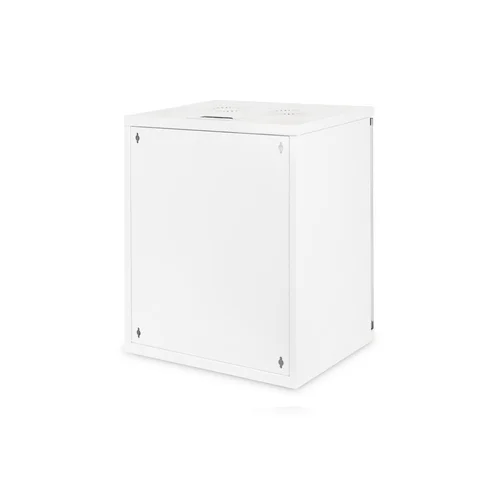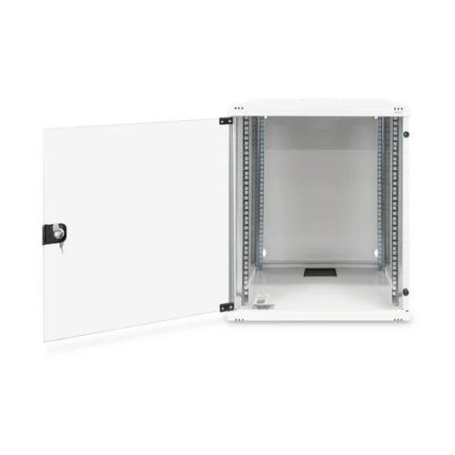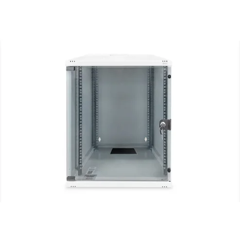 The DIGITUS® Wall Mounting Cabinets are made for high demand IT-Infrastructure Solutions - designed and developed on highest standard in Germany- Unmounted flat package delivery for cost- and space effciency- Optimized air ventilation and exhaustion- Lockable glass door ensures safetyThe 483 mm (19”) network cabinets for wall installation from the SOHO series are delivered unassembled using a flat pack to optimize costs. Available in four rack units and equipped with a full glass door as well as a cable entry with brushes in the roof and floor, this is the perfect product for subdividing or building up a small to medium-sized network. Two pairs of galvanized 483 mm (19”) profile rails labeled with easy-to-read rack units are installed on the inside. Their depth can be adjusted. Each cabinet is made of up to 1.5 mm thick sheet steel. Coloring is done with electrostatic powder coating in the standard colors gray (RAL 7035) or jet black (RAL 9005). The door hinges can be switched. Installation takes just a few steps and is extremely easy thanks to the step-by-step instructions included.