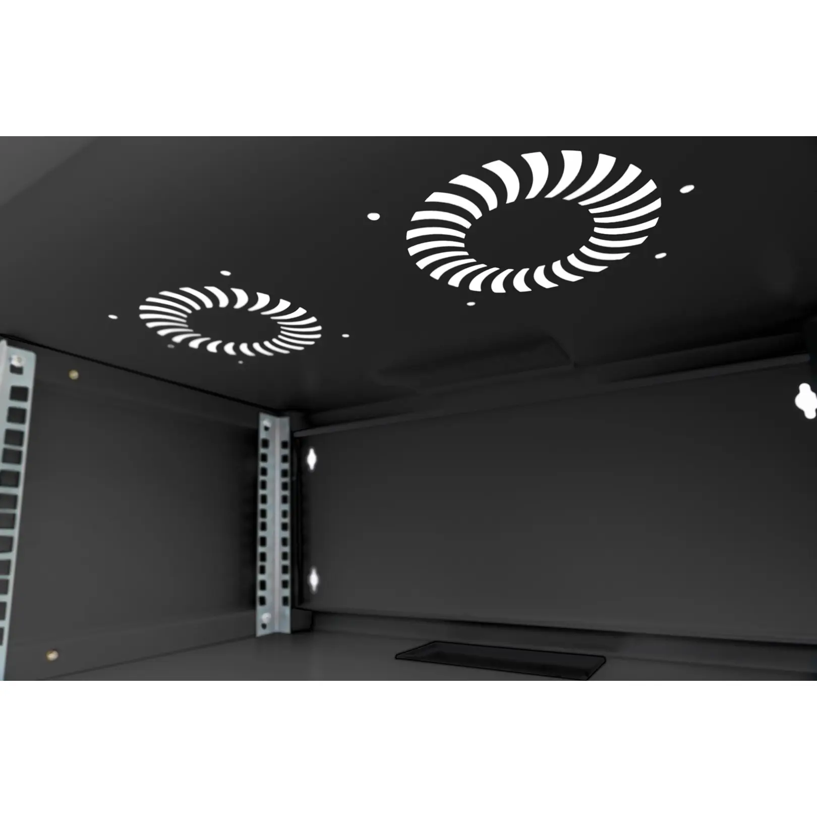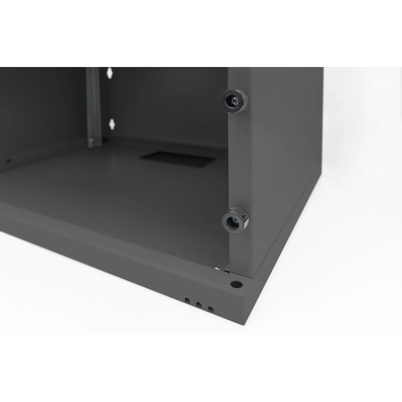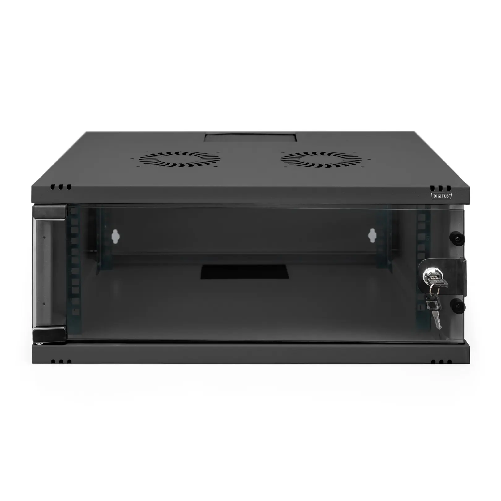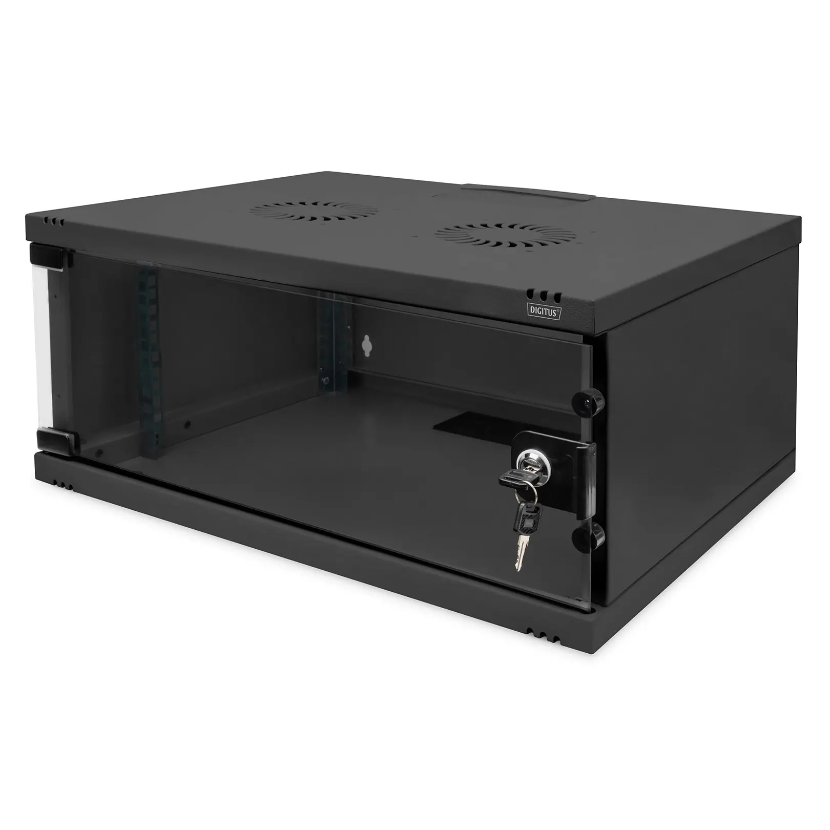 The DIGITUS® Wall Mounting Cabinets are made for high demand IT-Infrastructure Solutions - designed and developed on highest standard in Germany.- Unmounted flat package delivery for cost- and space effciency- Optimized air ventilation and exhaustion- Lockable glass door ensures safetyThe 483 mm (19”) network cabinets for wall installation from the SOHO series are delivered unassembled using a flat pack to optimize costs. Available in four rack units and equipped with a full glass door as well as a cable entry with brushes in the roof and floor, this is the perfect product for subdividing or building up a small to medium-sized network. Two pairs of galvanized 483 mm (19”) profile rails labeled with easy-to-read rack units are installed on the inside. Their depth can be adjusted. Each cabinet is made of up to 1.5 mm thick sheet steel. Coloring is done with electrostatic powder coating in the standard colors gray (RAL 7035) or jet black (RAL 9005). The door hinges can be switched. Installation takes just a few steps and is extremely easy thanks to the step-by-step instructions included.