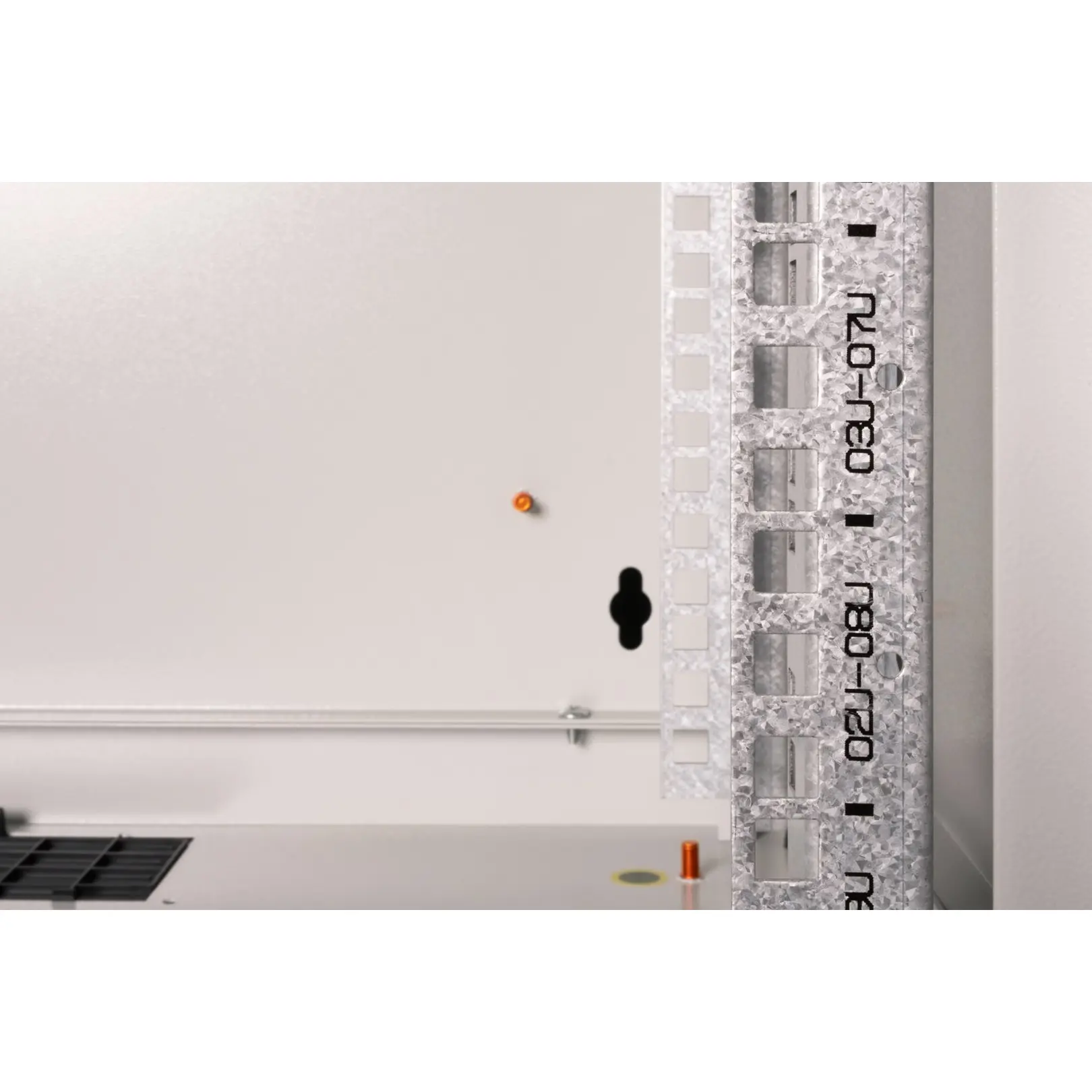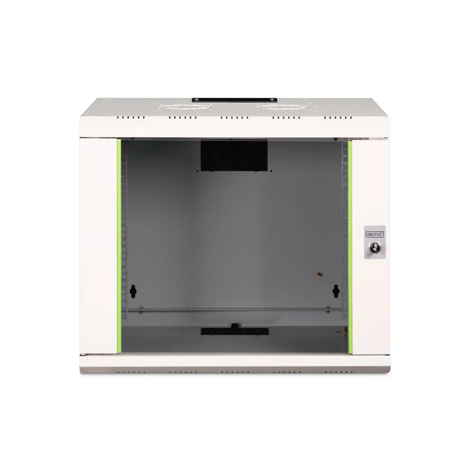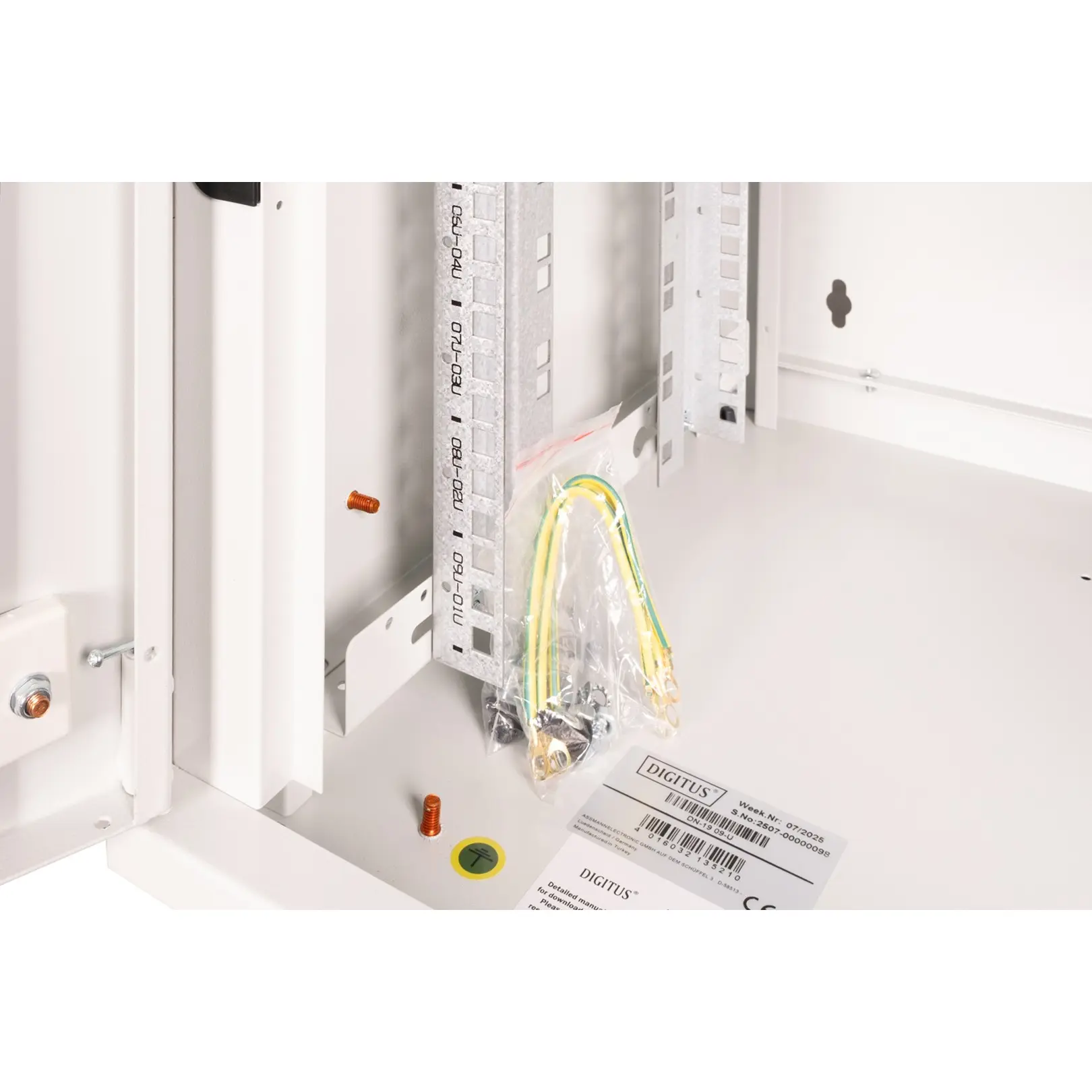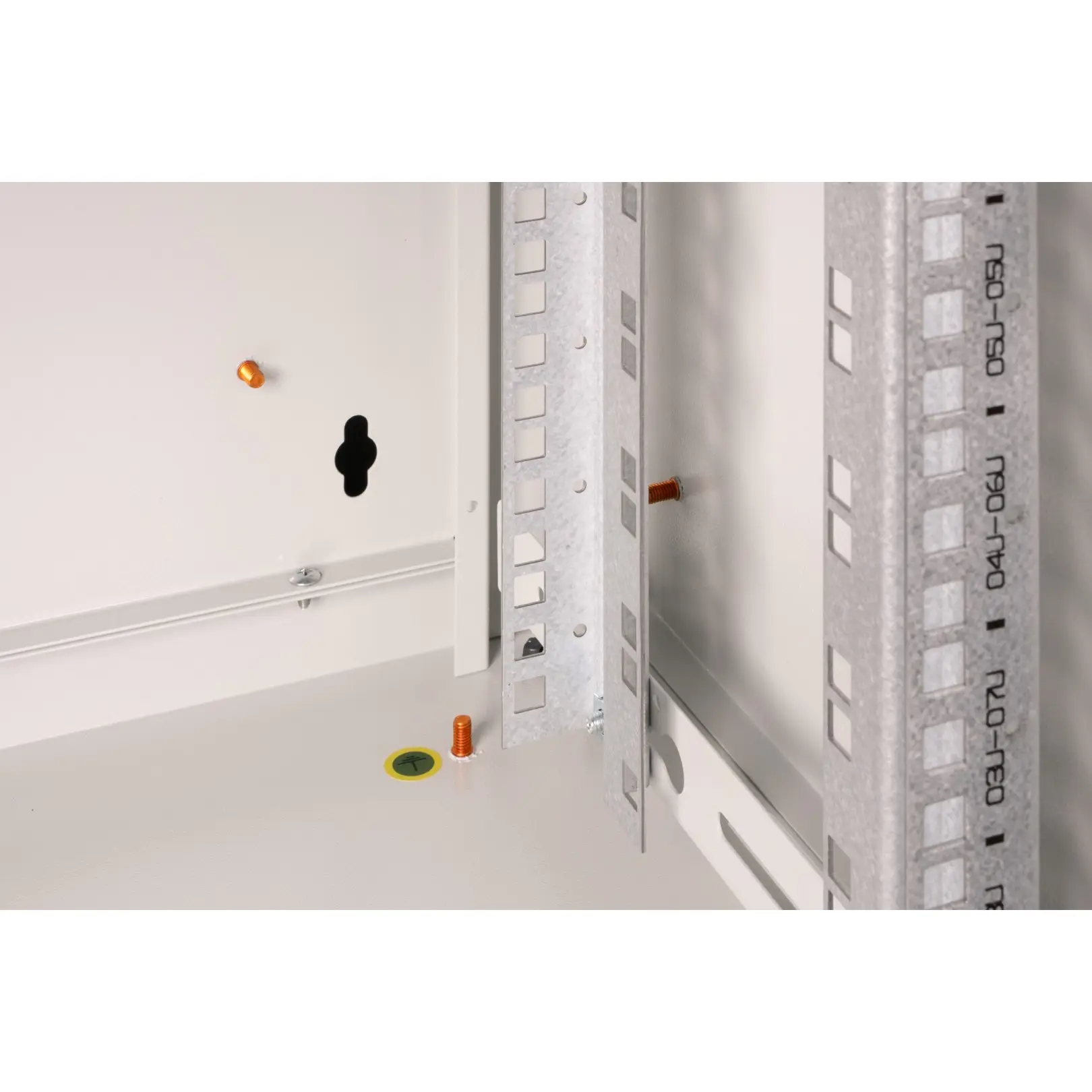The DIGITUS® Unique Series is made for high demand IT-Infrastructure Solutions - designed and developed on highest standard in Germany- Robust steel construction for sturdy wall mounting- Lockable safety-glass door with steel frame- Side panels are lockable and removableThe network cabinets for wall installation from the Unique series were developed for especially convenient and flexible network cabling. There is a sliding cable inlet with foam rubber seal in the roof of each cabinet. The back wall and floor plate are equipped with pre-cut cable inlets with a plastic cover. To accommodate a fan module, the roof structure is also equipped with a pre-cut area. Two pair of galvanized 483 mm (19”) profile rails labeled with rack units readable in both directions are installed on the inside. Their depth can be adjusted. Each cabinet is made of up to 1.5 mm thick sheet steel. Coloring is done with electrostatic powder coating in the standard colors gray (RAL 7035) or jet black (RAL 9005). Removable and lockable side walls in a modular design as well as lockable and removable front door improve accessibility. The door hinges can be switched. Wall installation is accomplished in two easy work steps: The housing frame plate is bolted on the wall and then connected with the housing. With optionally available levelling feet or casters, the wall housings from the Unique series can also be used as a free-standing unit.