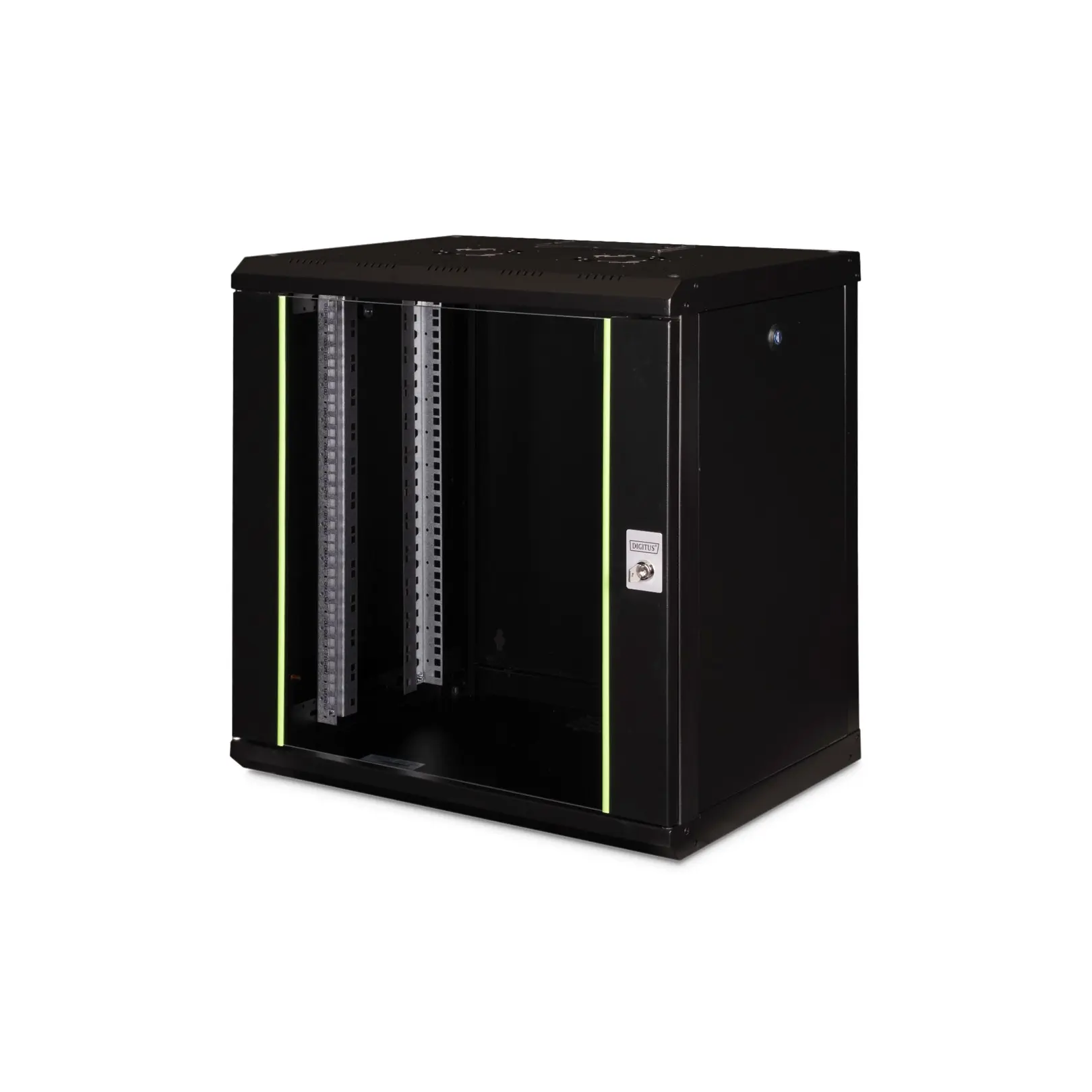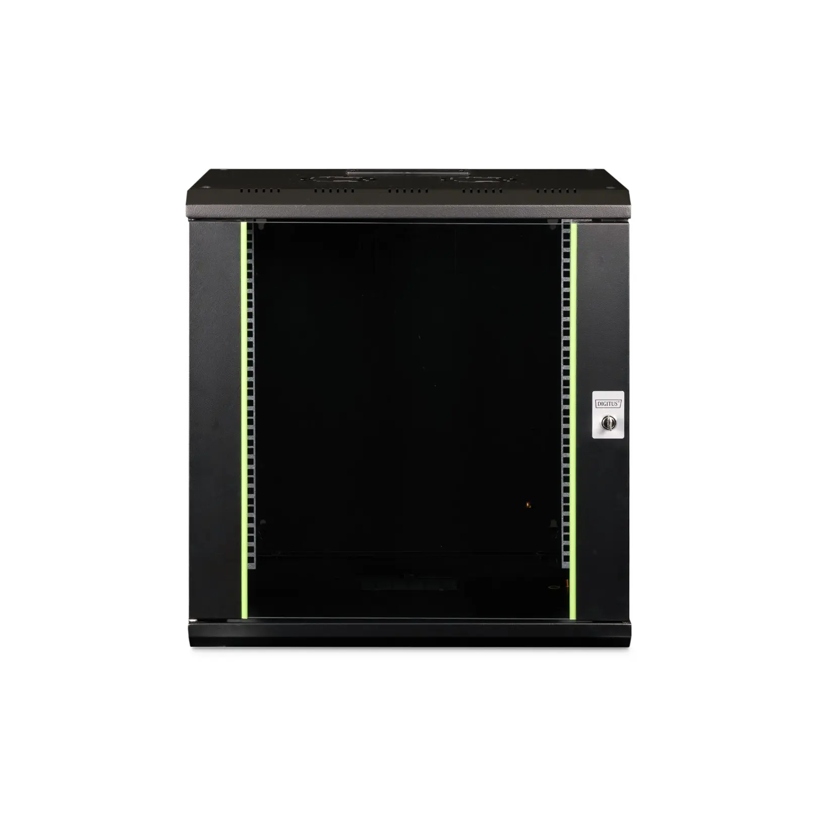 The DIGITUS® Unique Series is made for high demand IT-Infrastructure Solutions - designed and developed on highest standard in Germany- Robust steel construction for sturdy wall mounting- Lockable safety-glass door with steel frame- Side panels are lockable and removableThe network cabinets for wall installation from the Unique series were developed for especially convenient and flexible network cabling. There is a sliding cable inlet with foam rubber seal in the roof of each cabinet. The back wall and floor plate are equipped with pre-cut cable inlets with a plastic cover. To accommodate a fan module, the roof structure is also equipped with a pre-cut area. Two pair of galvanized 483 mm (19”) profile rails labeled with rack units readable in both directions are installed on the inside. Their depth can be adjusted. Each cabinet is made of up to 1.5 mm thick sheet steel. Coloring is done with electrostatic powder coating in the standard colors gray (RAL 7035) or jet black (RAL 9005). Removable and lockable side walls in a modular design as well as lockable and removable front door improve accessibility. The door hinges can be switched. Wall installation is accomplished in two easy work steps: The housing frame plate is bolted on the wall and then connected with the housing. With optionally available levelling feet or casters, the wall housings from the Unique series can also be used as a free-standing unit.