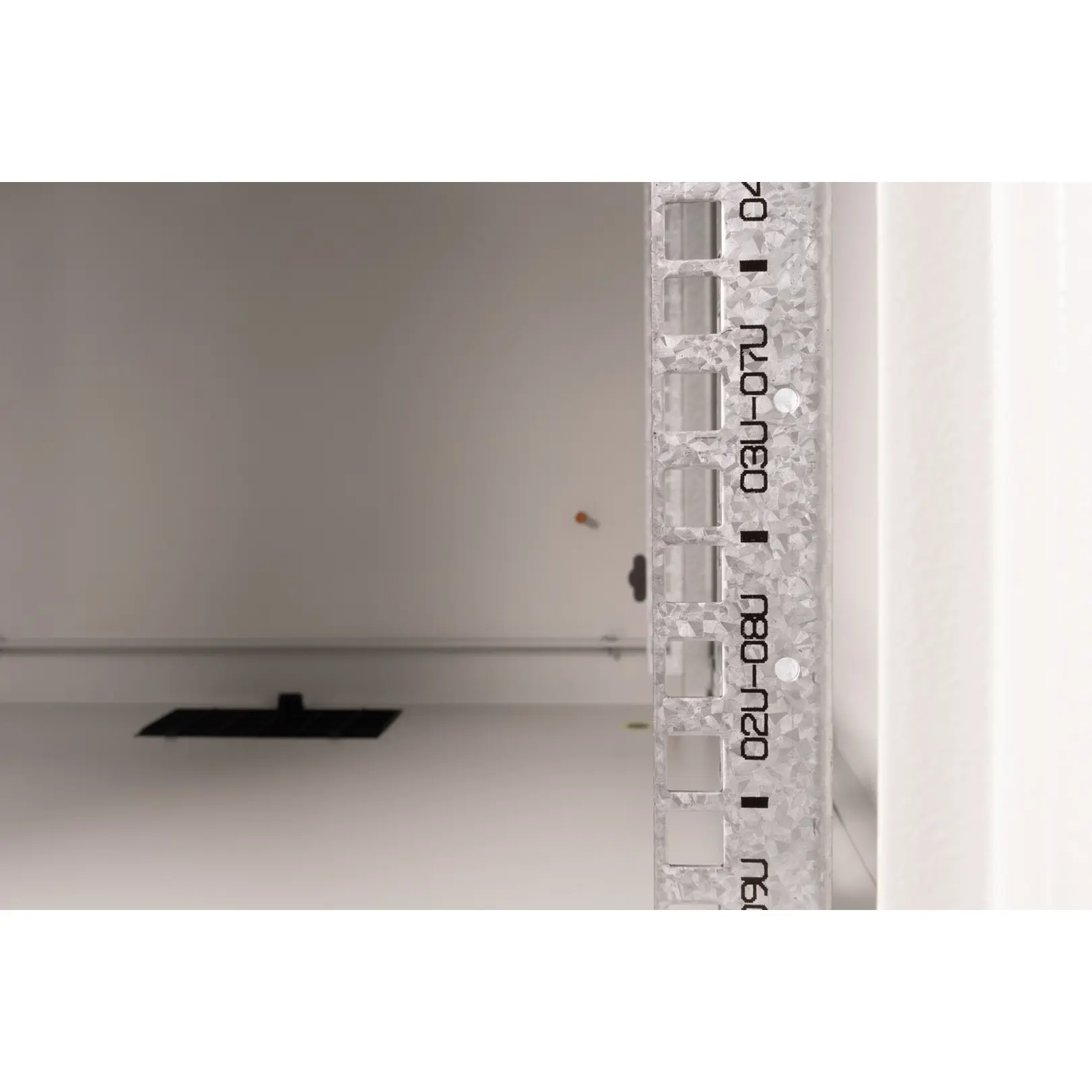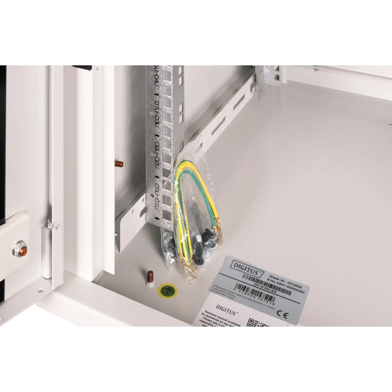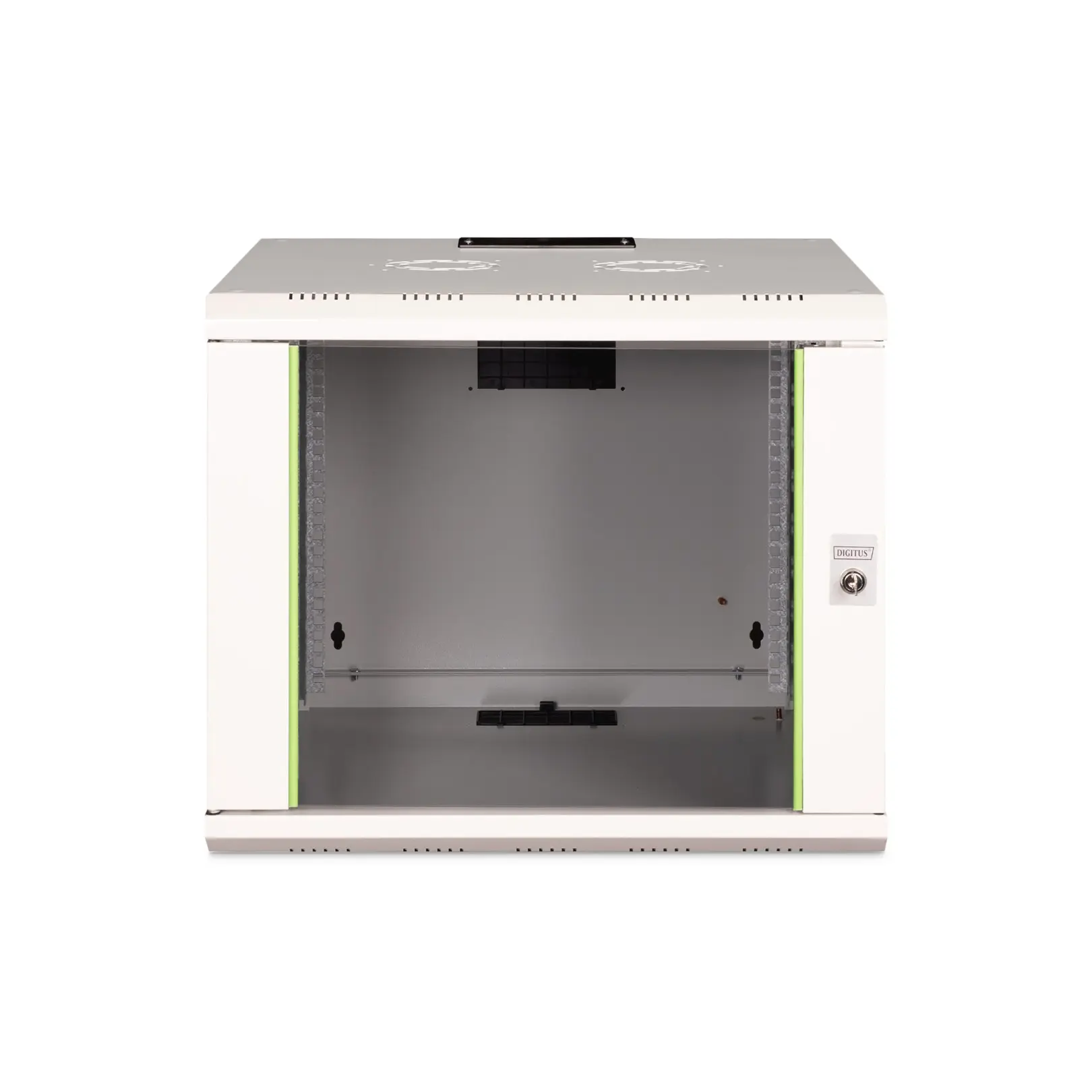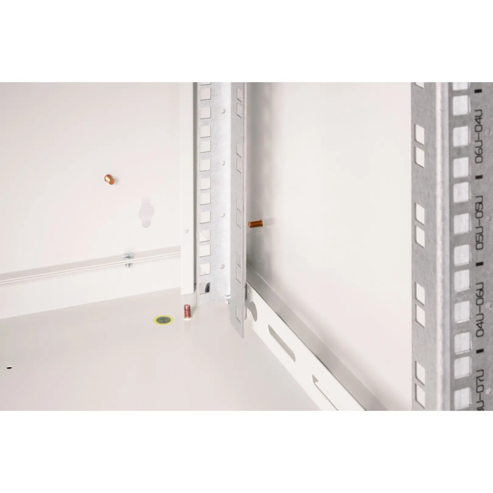 The DIGITUS® Unique Series is made for high demand IT-Infrastructure Solutions - designed and developed on highest standard in Germany- Robust steel construction for sturdy wall mounting- Lockable safety-glass door with steel frame- Side panels are lockable and removableThe network cabinets for wall installation from the Unique series were developed for especially convenient and flexible network cabling. There is a sliding cable inlet with foam rubber seal in the roof of each cabinet. The back wall and floor plate are equipped with pre-cut cable inlets with a plastic cover. To accommodate a fan module, the roof structure is also equipped with a pre-cut area. Two pair of galvanized 483 mm (19”) profile rails labeled with rack units readable in both directions are installed on the inside. Their depth can be adjusted. Each cabinet is made of up to 1.5 mm thick sheet steel. Coloring is done with electrostatic powder coating in the standard colors gray (RAL 7035) or jet black (RAL 9005). Removable and lockable side walls in a modular design as well as lockable and removable front door improve accessibility. The door hinges can be switched. Wall installation is accomplished in two easy work steps: The housing frame plate is bolted on the wall and then connected with the housing. With optionally available levelling feet or casters, the wall housings from the Unique series can also be used as a free-standing unit.