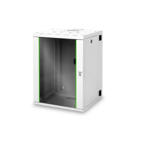 The DIGITUS® Unique Series is made for high demand IT-Infrastructure Solutions - designed and developed on highest standard in Germany- Robust steel construction for sturdy wall mounting- Lockable safety-glass door with steel frame- Side panels are lockable and removableThe network cabinets for wall installation from the Unique series were developed for especially convenient and flexible network cabling. Thanks to the integrated hinge in the back frame, the housing can be folded to the side if needed, for example in order to easily carry out assembly work in the back area of the cabinet. There is a sliding cable inlet with foam rubber seal in the roof of each cabinet. The back wall and floor plate are equipped with pre-cut cable inlets with a plastic cover. In addition, the back frame is equipped with brush management panels on the top and bottom. To accommodate a fan module, the roof structure is also equipped with a pre-cut area. One pair of galvanized 483 mm (19”) profile rails labeled with rack units readable in both directions are installed on the inside. Their depth can be adjusted. The back frame also has a 483 mm (19”) perforation. Each cabinet is made of up to 1.5 mm thick sheet steel. Coloring is done with electrostatic powder coating in the standard colors gray (RAL 7035) or jet black (RAL 9005). Removable and lockable side walls in a modular design as well as lockable and removable front door improve accessibility. The door hinges can be switched. Wall installation is accomplished in two easy work steps: The housing frame plate is bolted on the wall to open in either direction and then connected with the housing. With optionally available levelling feet or casters, the wall housings from the Unique series can also be used as a free-standing unit.