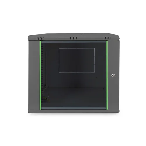 - 450 mm depth provides a space saving installation- Optimized air ventilation and exhaustion- Lockable safety-glass door with steel frameThe network cabinets for wall installation from the Dynamic series were developed for easy and especially cost-optimized network expansion. The roof, floor and back wall of each cabinet are equipped with a pre-cut cable inlet. To accommodate a fan module, the roof structure is also equipped with a pre-cut area. Two pairs of galvanized 483 mm (19”) profile rails labeled with rack units readable in both directions are installed on the inside. Their depth can be adjusted. Each cabinet is made of up to 1.5 mm thick sheet steel. Coloring is done with electrostatic powder coating in the standard colors gray (RAL 7035) or jet black (RAL 9005). Removable side walls as well as lockable and removable front door improve accessibility. The door hinges can be switched. Wall installation is accomplished in two easy work steps: The mounting plate provided is bolted on the wall and then connected with the housing.