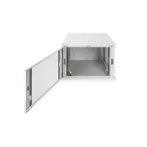 - Optimized air ventilation and exhaustion- Lockable glass door ensures safety- 483 mm (19“) profile rails mounted on the front- and rear side inside of the rack, galvanizedThe network cabinets for wall installation from the Dynamic series were developed for easy and especially cost-optimized network expansion. The roof, floor and back wall of each cabinet are equipped with a pre-cut cable inlet. To accommodate a fan module, the roof structure is also equipped with a pre-cut area. Two pairs of galvanized 483 mm (19”) profile rails labeled with rack units readable in both directions are installed on the inside. Their depth can be adjusted. Each cabinet is made of up to 1.5 mm thick sheet steel. Coloring is done with electrostatic powder coating in the standard colors gray (RAL 7035) or jet black (RAL 9005). Removable side walls as well as lockable and removable front door improve accessibility. The door hinges can be switched. Wall installation is accomplished in two easy work steps: The mounting plate provided is bolted on the wall and then connected with the housing.
