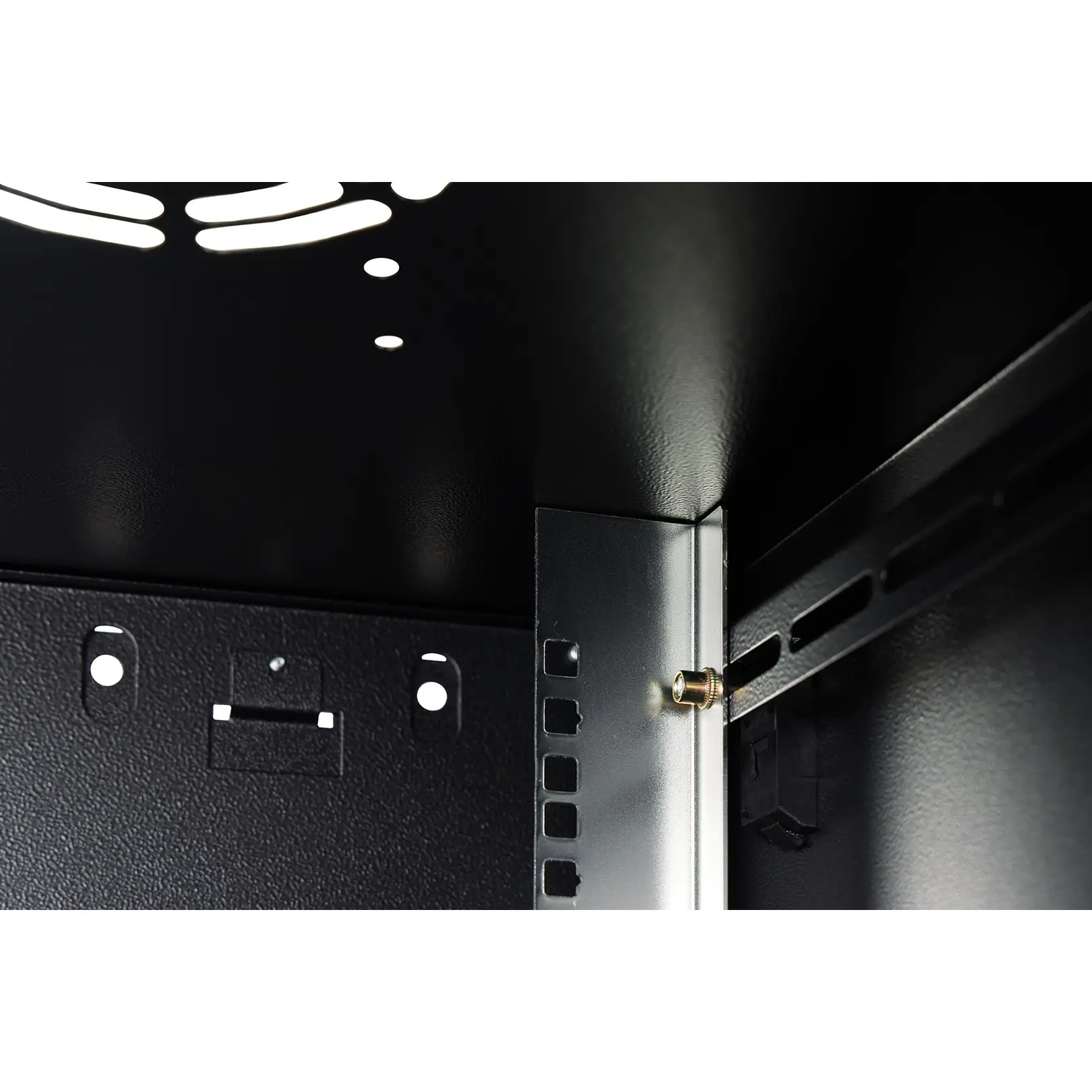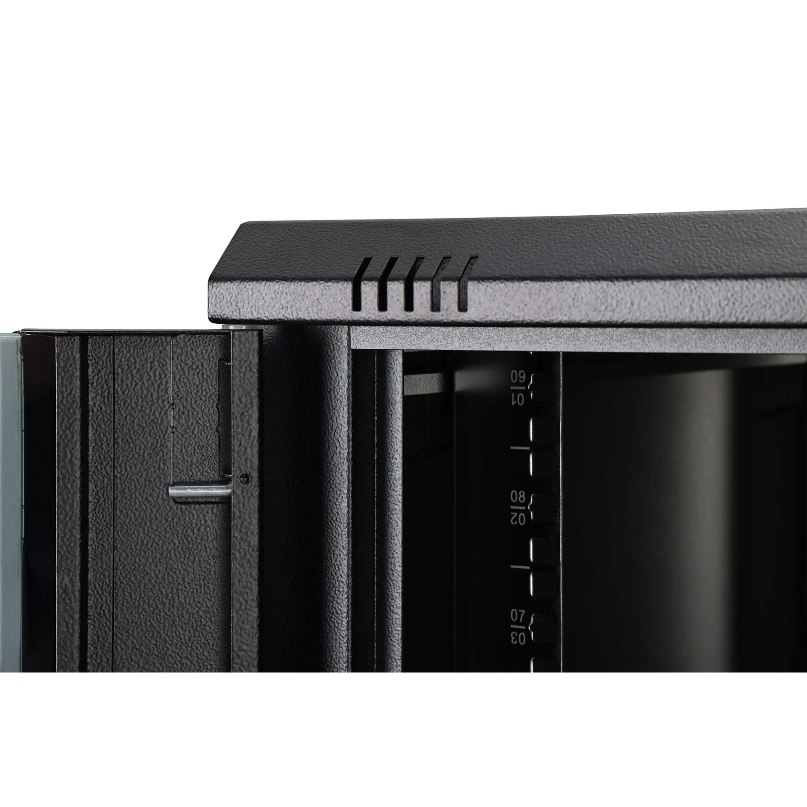 - Optimized air ventilation and exhaustion- Lockable glass door ensures safety- 483 mm (19“) profile rails mounted on the front- and rear side inside of the rack, galvanizedThe network cabinets for wall installation from the Dynamic series were developed for easy and especially cost-optimized network expansion. The roof, floor and back wall of each cabinet are equipped with a pre-cut cable inlet. To accommodate a fan module, the roof structure is also equipped with a pre-cut area. Two pairs of galvanized 483 mm (19”) profile rails labeled with rack units readable in both directions are installed on the inside. Their depth can be adjusted. Each cabinet is made of up to 1.5 mm thick sheet steel. Coloring is done with electrostatic powder coating in the standard colors gray (RAL 7035) or jet black (RAL 9005). Removable side walls as well as lockable and removable front door improve accessibility. The door hinges can be switched. Wall installation is accomplished in two easy work steps: The mounting plate provided is bolted on the wall and then connected with the housing.
