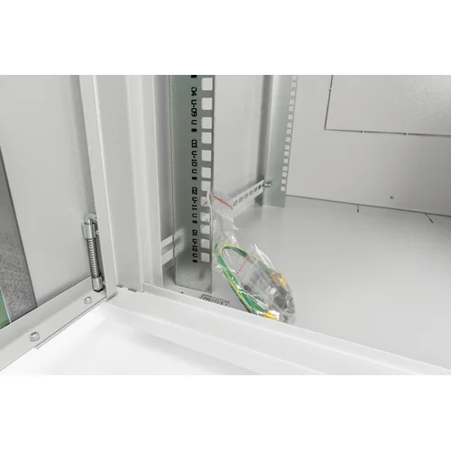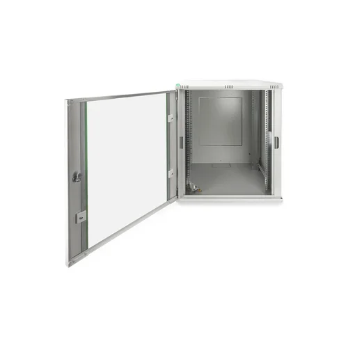 - Optimized air ventilation and exhaustion- Lockable glass door ensures safety- 483 mm (19“) profile rails mounted on the front- and rear side inside of the rack, galvanizedThe network cabinets for wall installation from the Dynamic series were developed for easy and especially cost-optimized network expansion. The roof, floor and back wall of each cabinet are equipped with a pre-cut cable inlet. To accommodate a fan module, the roof structure is also equipped with a pre-cut area. Two pairs of galvanized 483 mm (19”) profile rails labeled with rack units readable in both directions are installed on the inside. Their depth can be adjusted. Each cabinet is made of up to 1.5 mm thick sheet steel. Coloring is done with electrostatic powder coating in the standard colors gray (RAL 7035) or jet black (RAL 9005). Removable side walls as well as lockable and removable front door improve accessibility. The door hinges can be switched. Wall installation is accomplished in two easy work steps: The mounting plate provided is bolted on the wall and then connected with the housing.