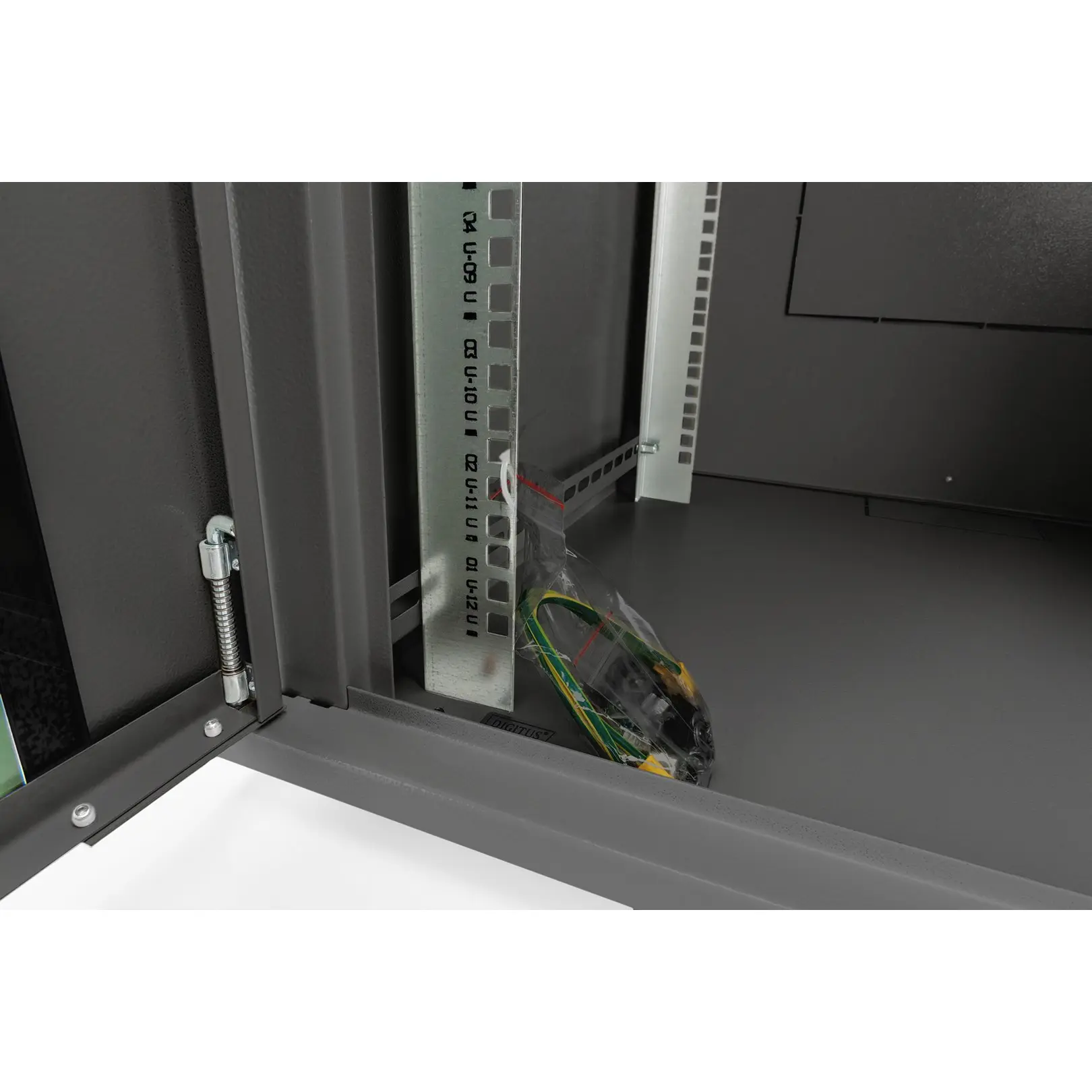 - Optimized air ventilation and exhaustion- Lockable glass door ensures safety- 483 mm (19“) profile rails mounted on the front- and rear side inside of the rack, galvanizedThe network cabinets for wall installation from the Dynamic series were developed for easy and especially cost-optimized network expansion. The roof, floor and back wall of each cabinet are equipped with a pre-cut cable inlet. To accommodate a fan module, the roof structure is also equipped with a pre-cut area. Two pairs of galvanized 483 mm (19”) profile rails labeled with rack units readable in both directions are installed on the inside. Their depth can be adjusted. Each cabinet is made of up to 1.5 mm thick sheet steel. Coloring is done with electrostatic powder coating in the standard colors gray (RAL 7035) or jet black (RAL 9005). Removable side walls as well as lockable and removable front door improve accessibility. The door hinges can be switched. Wall installation is accomplished in two easy work steps: The mounting plate provided is bolted on the wall and then connected with the housing.