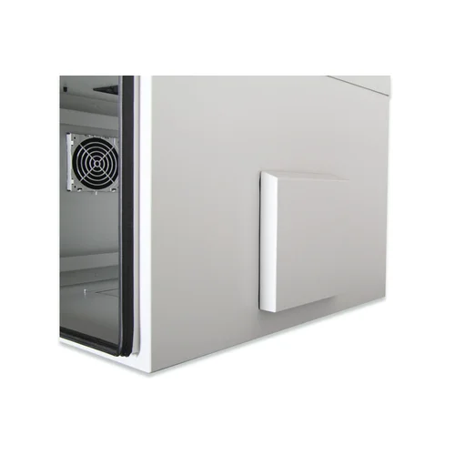 The DIGITUS® IP55 Outdoor Wall Mounting Cabinets are designed for industrial applications with protection against water and dust acc. to safety class IP55.- Protected against dust and water jets (IP 55)- Steel front door with lockable pivot lever and 3-point-locking mechanism- Front door with earthing lead and two welded, strengthening bars in U-shape as well as gasketting system- Free standing usage with additional plinth possibleThe industrial network cabinets for wall installation are specially adapted according to protection type IP55 for the requirements of harsh environments, particularly outdoors. The wall housings offer optimal performance in part thanks to the 3-point locking system with lockable swing handle and insulated PG cable glands. Integrated fan filter housing ensures fresh air supply (protection against penetration of water and dust pursuant to IP54). Applications including outdoor areas that are subject to environmental effects (rain, dust, hail, snow, spraying water). To accommodate a fan module, the roof structure is also equipped with a filtered area. One pair of galvanized 483 mm (19”) profile rails labeled with rack units readable in both directions are installed on the inside. Their depth can be adjusted. Each cabinet is made of up to 2.0 mm thick sheet steel. Coloring is done with electrostatic powder coating in the standard color gray (RAL 7035). Wall installation is carried out using the enclosed mounting bracket. Optionally, the cabinets can be used with a plinth as a free-standing solution or fastened to poles using the fastening set.
