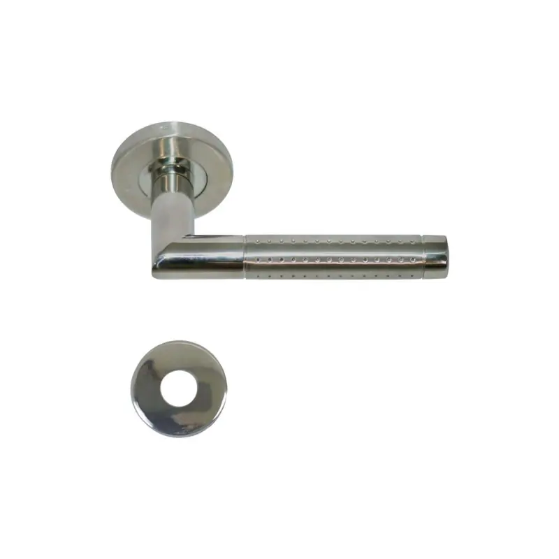 Barsac model handles with round rose plates, diameter 20 - stainless steel 304, two-tone satin and shiny x2, these handles, both shiny and satin, will fit perfectly into your interior. Decorated with stamps, they will add a modern touch to your doors. They come with two shiny stainless steel rose plates.