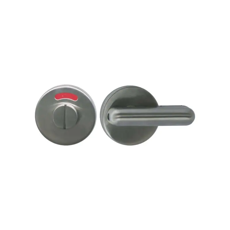 Cabin lock for aligned door and frame - brushed matte stainless steel 304 for fitting rooms or shower cabins in swimming pools and gyms. It is suitable for doors up to 3 cm thick. This cabin accessory allows for easy locking and unlocking of the door. Equipped with a green-red indicator "free occupied". A wedge (not supplied) should be added on the inside when the door and frame are not aligned.