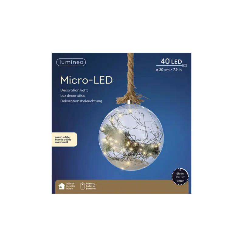 A decorative microled ball EDM of 40 lumens to bring the magic of Christmas into your home. A typical decoration element for the festive season that can be hung using a hemp cord (provided). However, you can also use it by placing it somewhere. The inside of the ball contains natural decoration as well as microled bulbs. The brightness emitted is 40 lumens and the white leans towards orange to create a warm festive atmosphere. The feature that makes the difference is the timer that can be set for 6 or 72 hours. Power is supplied via 3 AA batteries (not included).