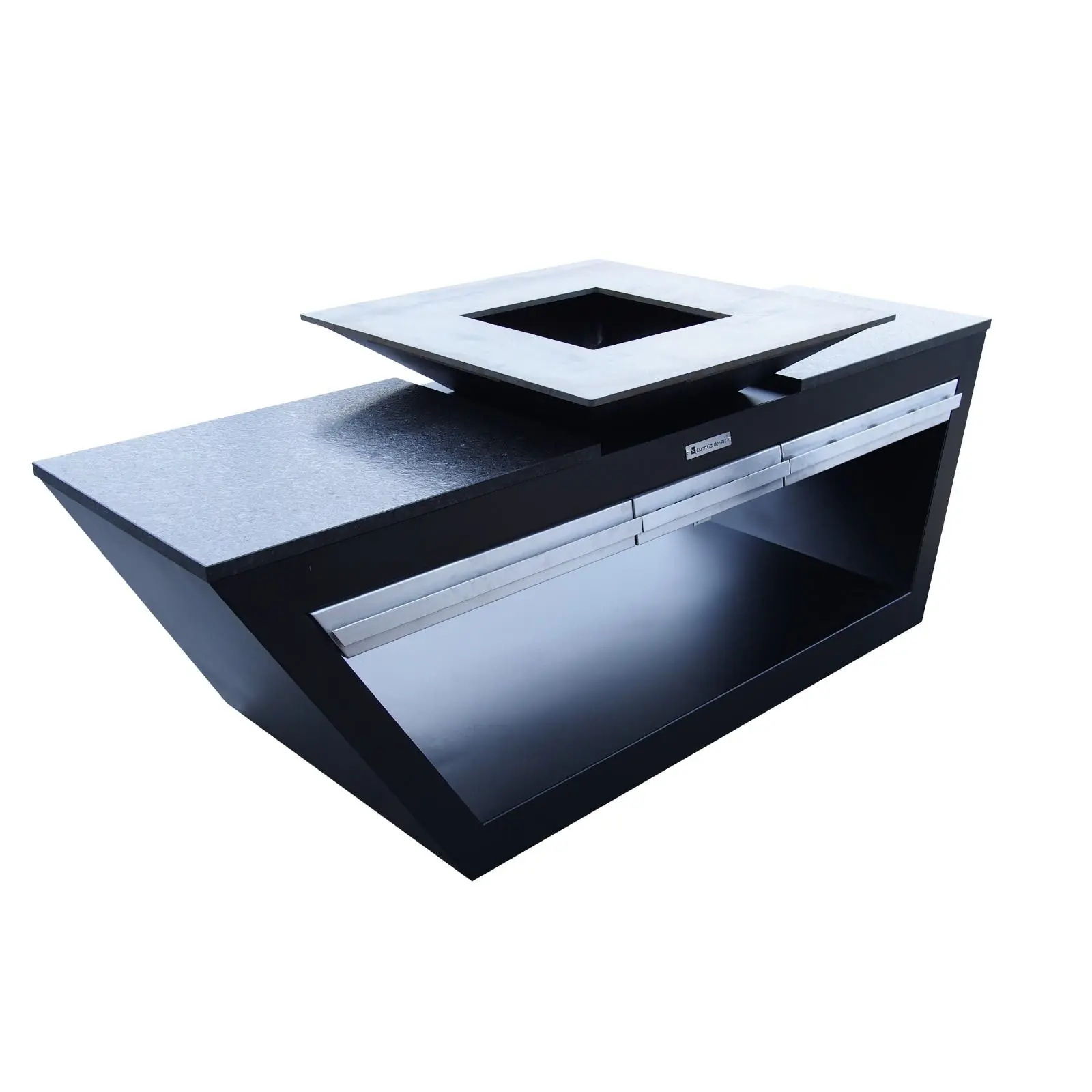 Main structure in steel with Carbon finish, 15 mm thick steel cooking plate, granite worktop, integrated ash collector, storage compartment for wood, air extraction system.