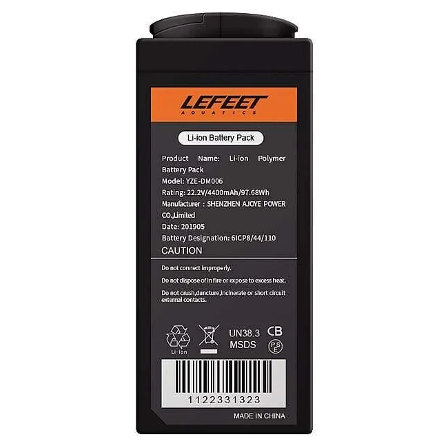 The LEFEET S1/S1 PRO Battery is a rechargeable lithium-ion polymer (LiPo) battery designed specifically for the LEFEET S1 and S1 PRO underwater scooters. This battery allows users to replace a faulty battery or extend their diving time by having a second charged battery ready for use.