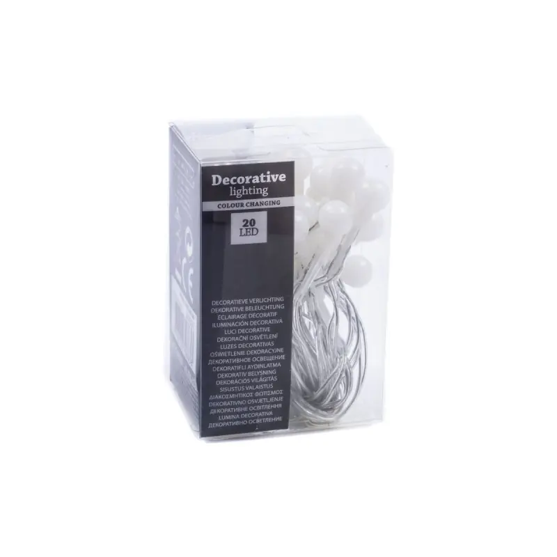 Thismini sphere LED fairy light garland - party atmosphere - multicolour - 20 LED bulbs - 2.3 m - 71312 sparkles and changes colour. With this set of multicoloured lights, the atmosphere will be more lively. The product is suitable for indoor use and uses low energy consumption thanks to its LED technology, consuming up to 85% less energy and lasting 20 times longer than incandescent bulbs. You can effortlessly use this battery-operated garland as a perfect accessory for your tree, fireplace, bed, as a decoration for parties, Valentine's Day, birthdays, Christmas, etc.