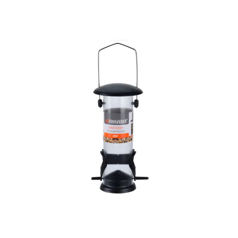 This PROGARDEN bird feeder - 23cm has been designed as a small restaurant for the birds in your garden. It is suitable for holding the usual bird food (such as seeds). Made from plastic with a metal base, it is very sturdy and will add a touch of modernity and aesthetics to your garden.