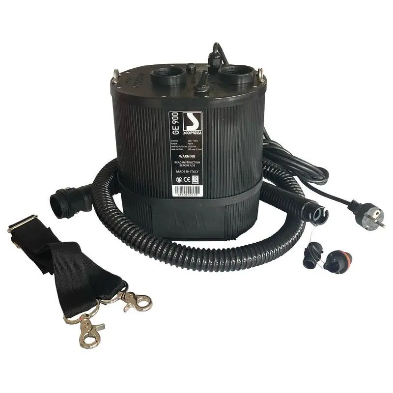 The Scoprega GE 900 Electric Inflator is a high-performance device designed for rapid inflation and deflation of various inflatable products, including tents, games, structures, and inflatable barriers. It offers a significant reduction in noise impact, operating at a maximum of 85 dB, making it suitable for both professional and recreational use.