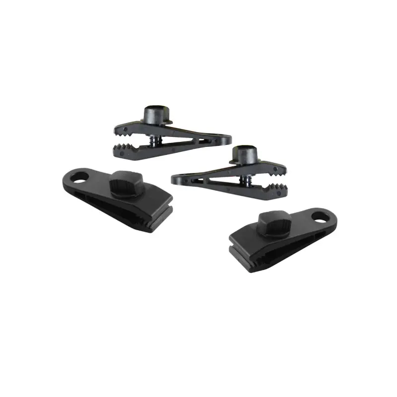 Pack of 4 Black Plastic Clip Clamps for Tarpaulins and Fabrics ideal for securing your tarpaulins, fabrics, etc. Durable, the clips feature a tightening system to lock the clamp's grip.