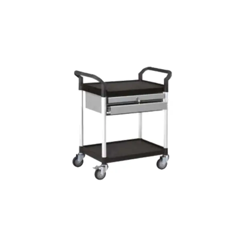 Drawer Trolley 250 KG - 2 Shelves and 2 Drawers - 85x48x95cm versatile and robust trolley with extruded aluminium uprights and 2 shelves made of polypropylene and fibreglass. The trolley is equipped with 2 drawers for tool storage. One of the drawers can be locked. The trolley is easily movable with handles on each side and 4 swivel castors, 2 of which have brakes. It can support up to 250 kg.