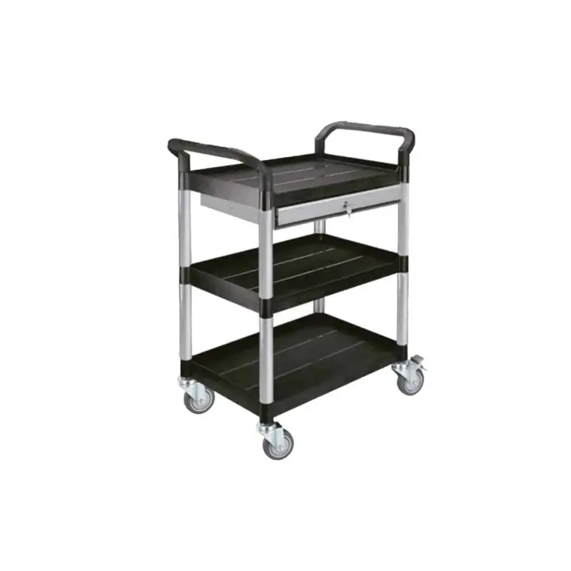 Drawer Trolley 250 KG - 3 Shelves and 1 Drawer - 85x48x100cm a versatile and robust trolley with extruded aluminium uprights and 3 shelves made of polypropylene and fibreglass. The trolley is equipped with a drawer for storing tools. This drawer can be locked. The trolley is easily movable with handles on each side and 4 swivel castors, 2 of which are fitted with brakes. It supports up to 250 kg.