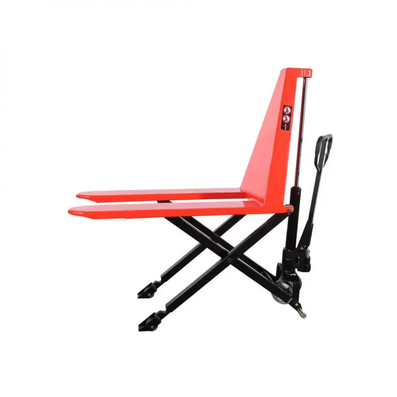 Manual high-lift pallet truck - 1000 kg equipped with two lateral stabilisers providing this pallet truck with excellent stability. A load lift of up to 1,000 kg effortlessly and up to 80 cm. For added safety, this product features a high chassis to protect the user.