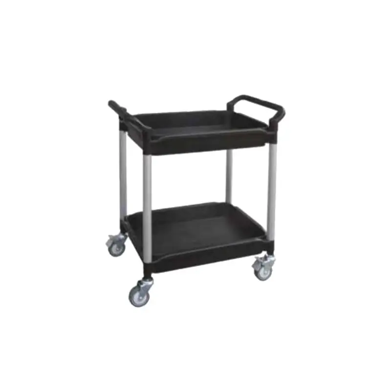 Multi-purpose trolley 180 KG - 2 trays with edges - 79x48x87.5 cm robust multi-purpose trolley with extruded aluminium uprights and 2 trays made of polypropylene and fibreglass. The trays are equipped with 10 cm high edges, allowing them to be used as cleaning bins. The trolley supports up to 180 kg. It is easily movable with handles on each side and 4 swivel castors, 2 of which are fitted with brakes.