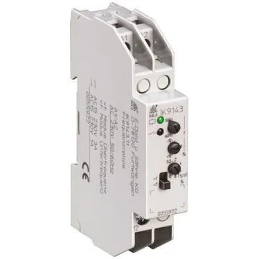 IEC/EN 60255, DIN VDE 0435-303. CE. IK9143 - Frequency relay. Detection of under/over frequency in alternating voltage networks; switchable No auxiliary voltage Switchable frequency range for 50 or 60 Hz networks Adjustable response value Adjustable hysteresis Rest current principle LED status display Overall width 17.5 mm