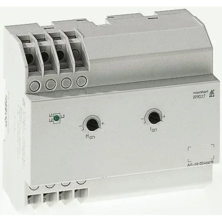 The IR9027 requires a clockwise rotating field and must not be operated with a capacitive load (e.g. reactive power compensation) at the output. In the decoupled state (without load), the starting behaviour is not particularly smooth. Soft Starter, IR9027. Soft starters are robust electronic control devices for starting three-phase asynchronous machines smoothly. Two of the three motor phases are influenced by the IR9027 by phase control in such a way that the current in these phases rises steadily. The motor torque behaves in exactly the same way during start-up. This guarantees that the drive can start up without jerking. It is impossible for drive elements to be damaged, because the abrupt starting torque caused by direct starting is not generated. A marked reduction of starting noise is also perceived. Slippage or tipping over of items being conveyed on belts is avoided. After starting, the power electronics are bridged via an internal relay contact to minimise losses in the device. Applications. Machines with gear, belt and chain drives Conveyor belts, fans, pumps, compressors Packaging machines, door operating mechanisms. Features. Increases the service life of asynchronous motors and mechanical drive components Easy installation even in existing systems No need for a neutral conductor Starting time and starting torque can be adjusted separately. Can be combined with motor brake units. An f/V converter is frequently not needed for simple applications 2-phase control of the motor For motor ratings up to 5.5 kW Power semiconductor bridged after successful start-up LED display Suitable for snapping onto a 35 mm standard top-hat rail 105 mm overall width