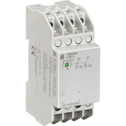 IL9071 — undervoltage relay, 3 phase. Single phase connection also an option Fixed fall-back value Closed circuit current principle LED display of switch state Adjustable phase sequence 2 changeovers 35 mm overall width Input Nominal voltage UN: AC 230 / 400 V Nominal frequency: 50/60 Hz Overload capacity: 1.1 UN continuous Fall-back value Uout: 0.85 UN Hysteresis: 4% fixed Output Contact assignment: 2 changeovers Thermal current: 4 A Switching capacity: 1 A (AC 11, 230 V). Monitoring of 3 phase systems for undervoltage or phase failure and activation of security lighting in accordance with VDE 0108 (IEC 255, VDE 0435 Part 303).