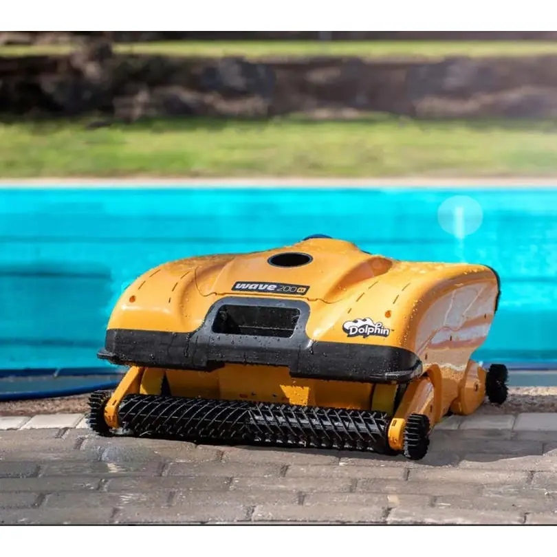 The Dolphin Wave 200 XL features a simple and clever water entry system. You position the caddy facing the pool, start the pool mode, and the robot exits its caddy and dives into the water by itself. The water exit is also assisted. The filter is removed from the top for clean, quick maintenance without direct contact with the collected debris.