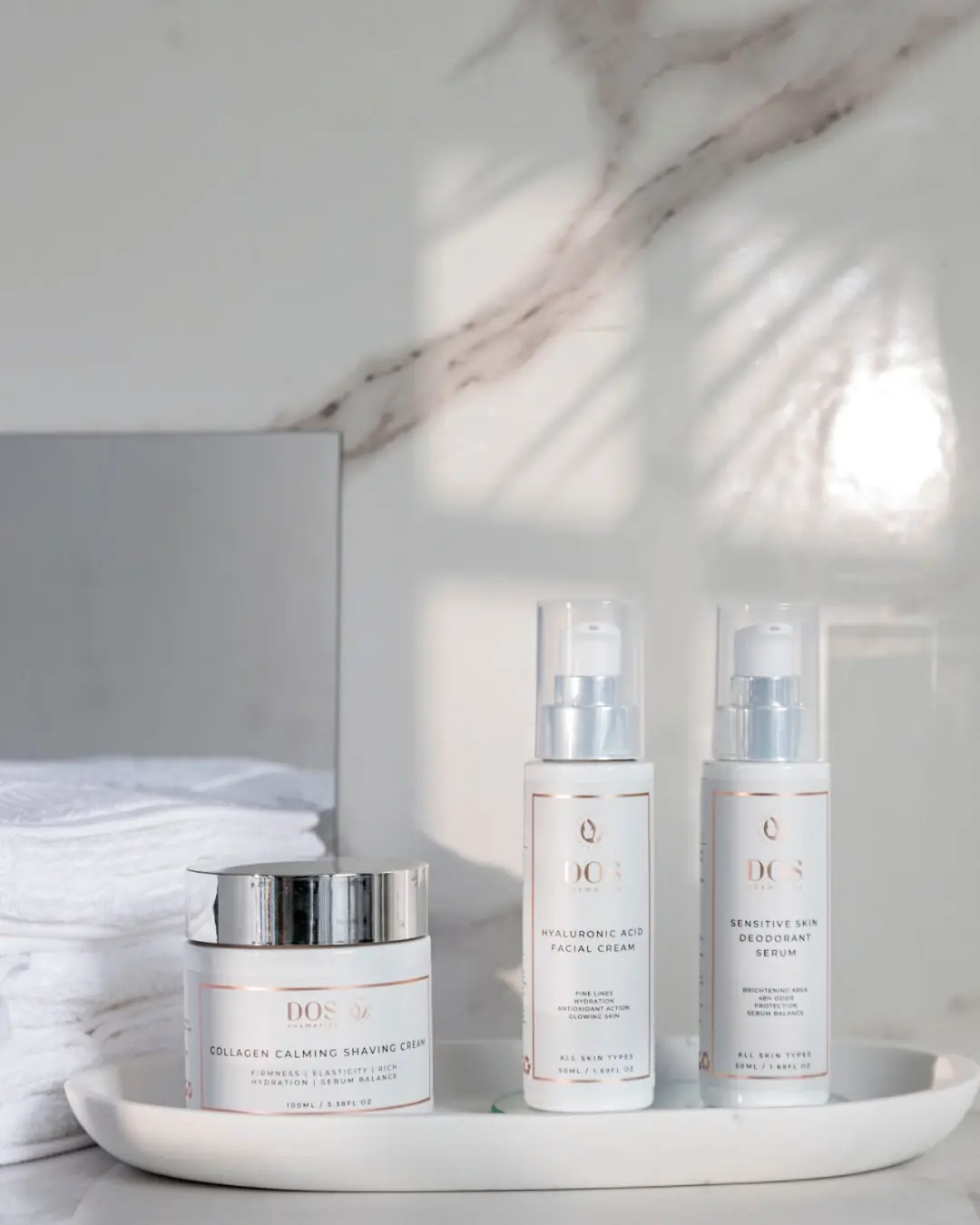 Transform your daily shaving routine into a luxurious experience with the Collagen Shaving Cream from DOS Cosmetics. This premium product is infused with Marine Collagen, a powerful ingredient renowned for its anti-aging benefits and ability to enhance skin elasticity. By combining the functionality of a shaving cream with the nourishing properties of collagen, DOS Cosmetics offers a unique solution that not only ensures a smooth shave but also cares for your skin's health and appearance. Key Benefits: Smooth Shaving Experience: The rich, creamy texture of this shaving cream provides an exceptional glide, allowing your razor to move effortlessly across your skin. This reduces friction and irritation, making it ideal for sensitive skin types. Marine Collagen: This key ingredient is sourced from marine environments and is known for its high bioavailability. It helps to improve skin elasticity, reducing the appearance of fine lines and wrinkles, and promotes a more youthful complexion. Hydration and Moisturization: The collagen in this shaving cream works to lock in moisture, ensuring your skin remains hydrated and supple even after shaving. This is particularly beneficial for dry or combination skin types, as it helps to balance moisture levels and reduce the appearance of dry patches. Anti-Aging Benefits: By incorporating collagen into your shaving routine, you're not just shaving—you're investing in your skin's long-term health. This can lead to a more radiant and resilient complexion over time. Suitable for All Skin Types: Whether you have normal, dry, combination, or sensitive skin, this shaving cream is designed to be gentle and effective. It's perfect for those seeking a reliable, high-quality shaving experience without compromising on skincare. How It Works: Pre-Shave Preparation: Apply a small amount of the Collagen Shaving Cream to your dampened skin, creating a rich lather. Shaving: Use your razor to shave in smooth, even strokes, allowing the cream to facilitate a close and comfortable shave. Post-Shave Care: Rinse your skin thoroughly with lukewarm water, then pat dry with a towel. Follow up with a moisturizer or aftershave balm to lock in hydration. Why Choose DOS Cosmetics Collagen Shaving Cream? This Innovative Formula, combining shaving functionality with skincare benefits, this product stands out from traditional shaving creams. The Luxurious Feel the creamy texture provides to the skin making every shave a pampering experience. The inclusion of Marine Collagen ensures that your skin receives nourishment and care, even during a routine activity like shaving. Incorporating the Collagen Shaving Cream from DOS Cosmetics into your daily routine is more than just a grooming habit—it's an investment in your skin's health and appearance. Experience the difference of a smooth, irritation-free shave combined with the anti-aging benefits of collagen, and discover a more radiant complexion with every use.