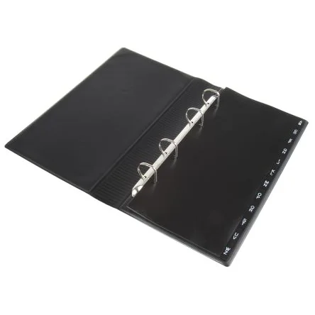 VISIFIX binder for business cards, Centium A4. The Centium range of office products offers unrivalled ease of use and a unique design. Functional and stylish, this wide range lets you equip your office harmoniously with high-quality products. 2403 – VISIFIX binder for business cards. Stylishly designed binder with 25 transparent pockets for 200 business cards in 57 x 90 mm format. 12-part plastic index with printed tabs A-Z. 4-ring mechanism. Dimensions (mm): L 255, W 146, H 47. 2387 – Pockets for business card album binder. Polypropylene pockets for 80 business cards. Capacity of each pocket: 20 business cards in 57 x 90 mm format. Universal holes. Sold in packs of 10 pockets. 2389 – A4 business card pockets. Polypropylene pockets for 200 business cards. Capacity of each pocket: 20 business cards in 57 x 90 mm format. Universal holes. A4 size. Sold in packs of 10 pockets. 2409 – VISIFIX Centiun A4 business card album binder. A4 binder for 400 business cards in 57 x 90 mm format. Supplied with 20 transparent, polypropylene pockets, each holding up to 20 cards. 12-part plastic index with printed tabs A-Z. Additional set of pockets available (ref. no. 2389: extension set for 200 business cards).