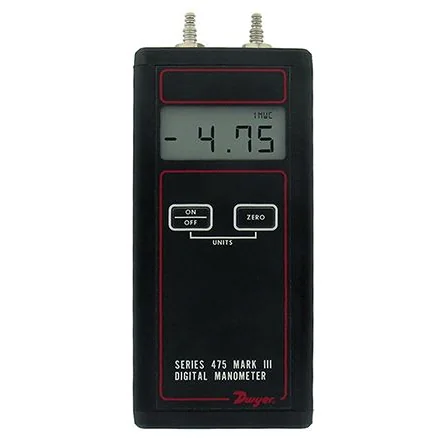Dwyer Instruments 475 Series Digital Manometers. Dwyer Instruments 475 series Mark III hand held digital manometer measures positive, negative or differential pressures of air and natural gases. The dual push buttons on the front panel control the on/off, auto zero, and pressure unit selection, allowing for simple operation with no set-up needed. When used with a pitot tube (u), the Series 475 can also be used as an air velocity gauge. Rugged aluminium case protects instrument from damage during transport/use Large, easy to read LCD and simple operation