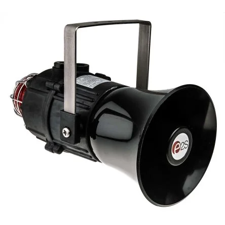 DEMKO 06 ATEX 0421554. II 3G EEx nL IIC T3. E2S Sounder Beacon. Combining a 116dB alarm sounder with a 5 joule Xenon strobe beacon, this sounder beacon provides a convenient and versatile audio-visual signalling solution, designed to reduce installation time and costs associated with multiple unit installations. The E2x range features sounder beacons that are perfect for the harshest of environments, benefiting from enclosures manufactured from lightweight and corrosion-proof PPS, and high impact, fire-retardant ABS re-entrant flare horns. Features and Benefits. The device has a very large termination area, and duplicate cable terminations Automatic synchronisation on multi-sounder system The Xenon tube is mechanically secured against vibrations and shocks and can be replaced by the user on assembly. Featuring a stainless steel dome guard as standard and a stainless steel adjustable 'U' bracket The sounder beacon is available with custom tone configurations and frequencies. Applications and Uses. Beacon and sounder combinations can be used in a variety of industrial and emergency applications for signalling and communication, such as; fire evacuations industrial parks warehouses laboratories. Approvals. ATEX certificate: DEMKO 06 ATEX 0421554X, IECEx certificate: IECEx ULD 14.0012X UL/cUL File ref: E230764