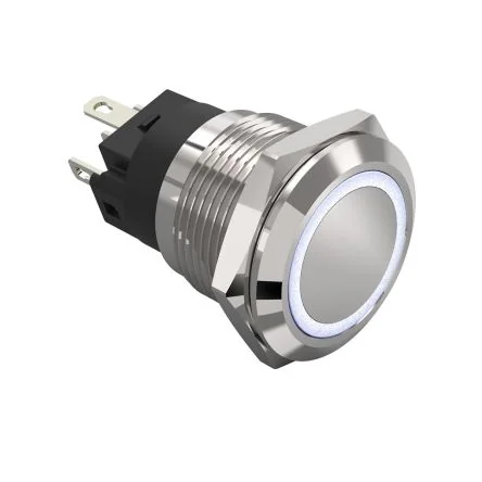 Reliable momentary illuminated push button switch with a 19mm cutout and white LED for clear visibility.