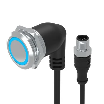 Durable illuminated push button switch with blue LED, ideal for panel mounting.