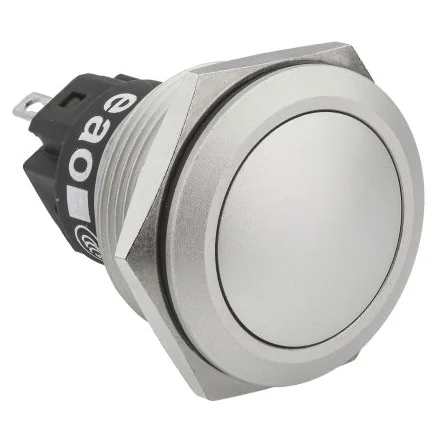CE, UL. EAO Series 82 Anti-Vandal Switches Non-Illuminated. Series 82 anti-vandal switches from EAO. The switches have an aesthetic design combined with a robust metal housing and conform to protection ratings; IK10 (physical attack) and IP67 (Dust and waterproof), making them ideal for use in public areas and harsh conditions. Three size versions are available for mounting into cut-outs of 16, 19 and 22mm. Aluminium construction Flat, convex and raised button types available Excellent tactile switching action
