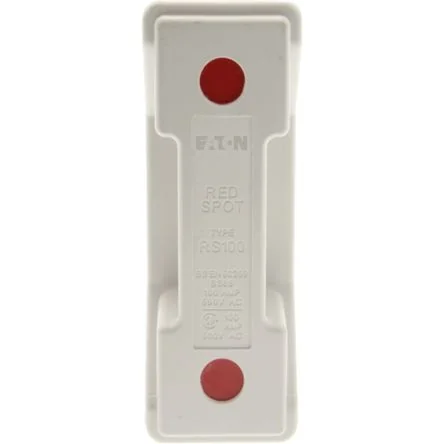 Fuse-holder, LV, 100 A, AC 690 V, 1P,front connected, whiteFor electrical systems and equipment up to 400 amps and 600Vac/dc Large, proven contact system and anti-vibration feature helps ensure perfect carrier contact alignment and superior electrical contact Conductor insulating sleeves help prevent inadvertent contact at the entry point, fully shrouded terminals Molded parts made from flame-retardant, non-hygroscopic, high dielectric strength phenolic material A broad range of accessories and Bussmann fuses available for all Red Spot fuse holders