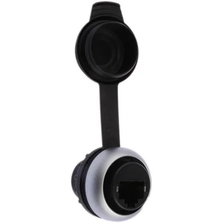 Eaton M22-RJ45-SA Bulkhead interface, RJ45 Socket 8/8, cat. 5e The RJ45 connector is the most commonly known type. This 8 pole RJ45 socket offers a connection for routing Ethernet cables through a bulkhead interface offers an IP rating of IP20 which provides protection against solid object up to 12mm and an IP rating of IP65 when the cap is closed offering protection from dust and water jets or liquids. This push button accessory is for use with 22.5 mm modular push buttons. This type of Ethernet connector is used for connecting to a network for networking such as telecommunications or data equipment.
