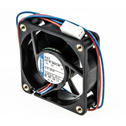 ebm-papst Compact DC Fan Assemblies with Inserts and Connectors. ebm-papst compact DC fans are suitable for high air performance with moderate pressure build-up and feature threaded inserts in each corner to take an M3 threaded bolt and a Molex 22-01-2025 connector. Ideal for PC cooling and various other applications. • DC fans • Plastic housing • Molex connector fitted • Threaded inserts for easy mounting • Connection via lead 313mm (+/- 10mm) • Threaded brass inserts fitted on both sides • Blowing over struts • Protection IP20