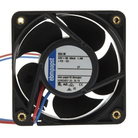 ebm-papst 624M Series Axial FansThe ebm-papst 624M series fan is a square-shaped, compact size plastic cooling fan. This axial series fans are suitable for high air performance with moderate pressure build up. The flow of air through the fan blades is parallel to the rotation axis. It provides protection against blocked rotor and reverse polarity. The fan has an electrical rating of 24VDC, 1.2A and 1.5W with a speed of 4550rpm.Features and Benefits• External and internal temperature sensor • Has speed limit alarm • Moisture protection • Noise Level is 29dBApplications• Explosion protection • Industrial electronicsCertifications• CE certified • CSA certified • UL approved • VDE approved