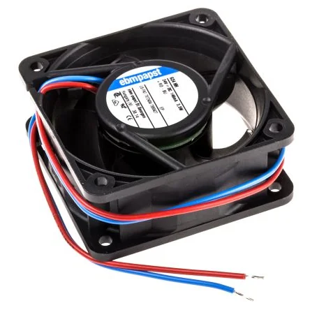 ebm-papst High Pressure Axial Fans. • DC ball bearing fan with electronically commutated external rotor motor • Electronic protection against reverse polarity, blocking and overloading by PTC-resistor; partially impedance protected • Fan of fibreglass reinforced plastic. PBTP housing and PA impeller • Air exhaust over struts, rotational direction clockwise looking at rotor • High pressure build-up • Low impact sound development • Electrical connection via 2 leads AMG22 TR64. Stripped and tinned ends • Mass 85g