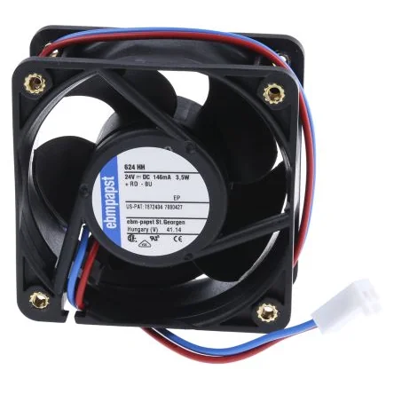 ebm-papst Compact DC Fan Assemblies with Inserts and Connectors. ebm-papst compact DC fans are suitable for high air performance with moderate pressure build-up and feature threaded inserts in each corner to take an M3 threaded bolt and a Molex 22-01-2025 connector. Ideal for PC cooling and various other applications. • DC fans • Plastic housing • Molex connector fitted • Threaded inserts for easy mounting • Connection via lead 313mm (+/- 10mm) • Threaded brass inserts fitted on both sides • Blowing over struts • Protection IP20