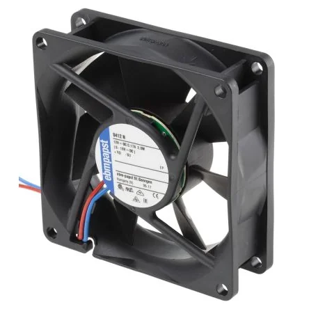 ebm-papst 8400 N Series DC Axial Fans. What is A DC Axial Fan?. DC axial fans are designed to create airflow with a high flow rate and medium pressure. Axial fans have an impeller surrounded by blades which works in a similar way to a propeller. The motor of the fan is integrated into the hub of the impeller to provide a compact fan unit. The impeller draws in air axially in a parallel direction to the revolving motor shaft and forces air out in the same direction. The axial fan is surrounded by a flanged housing with mounting holes allowing it to be mounted inside equipment. Efficient and Reliable Motor. • External Rotor Motor: Unlike traditional internal rotor motors where the rotating shaft is surrounded by electromagnetic coils ebm-papst fans feature an external rotor motor. In an external rotor motor the magnetic coils are encased inside a rotating shell. The advantage of this design is that external rotor motors are more compact in size, run more efficiently and are less prone to overheating than internal rotor motors • Brushless Motor: These DC fans have brushless motors where the electrical switching is carried out by electronic circuits rather than metal brushes. As they don't have any brushes to wear out, brushless motors are more efficient and reliable than AC motors and have a longer life span. The integrated electronics of brushless motors also allow extra interface options and motor protection to be built into the fan. Expertly Designed. The fan impellers and the inner shape housing of the ebm-papst compact DC axial fans are expertly designed using state-of-the-art computer software. The blades are aerodynamically engineered and dynamically balanced in two planes for optimum performance. The air output and motor performance are precisely matched to the size of the fan which results in low noise, even at high back pressure. Key Features and Benefits of the EBM Papst 8400 N and 8400 NG Series. • Performance from 33m ;sup>3 ;/sup>/h to a maximum of 79m ;sup>3 ;/sup>/h, depending on variant • Low, medium and high speed versions available • Fan motor integrated into the impeller hub to form a compact fan unit • External rotor motor with efficient and reliable brushless design • Air exhaust over the struts • Compact 80 x 80 mm design with small installation depth of 25 mm • Expertly designed for maximum efficiency and performance • Choice of durable ball bearings for high ambient temperatures and high service life or PAPST Sintec sleeve bearings for low noise and low shock sensitivity • Aerodynamic blades for low noise level and increased efficiency • Flanged housings with mounting holes for installation into equipment • Lightweight design with glass fibre reinforced plastic housing and impeller • Reverse polarity and locked rotor protection • IP20 protection rating • Service life of 117500 hours and above. How Do I Connect the Fan?. These 8400 N series DC axial fans feature AWG 24, TR 64 single wires which are stripped and tin plated at the end. What Accessories are Available?. • Metal and plastic finger guards: stock numbers ; 826-1376 826-1376 , ; 826-1379 826-1379 , ; 250-870 250-870 , ; 101-8068 101-8068 , ; 512-569 512-569 and ; 826-1373 826-1373 • Filter Fan Guard: stock number ; 221-336 221-336 , ; 507-911 507-911 and ; 200-7659 200-7659. Applications. These DC axial fans are designed for hot or cold air exchange in a wide range of devices and systems. These applications include the following:. • Audio/Video • Catering • Control equipment • Data storage • Domestic Appliances • Electronics • Heating and Ventilation • Laboratory • Lasers • Lighting • Machines ; Industrial • Pharmaceutical • Power optimisation • Power Supplies
