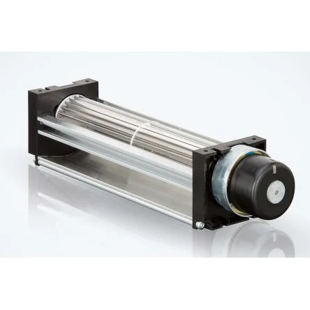 ebm-papst Tangential BlowerThe ebm-papst tangential crossflow blower has an airflow of 139.4m³/h and a supply voltage rating of 24VDC. It is 47.5mm long, 363mmwidth and 50mm deep. It has a washable filter, an internal filter guard and front grill with fixings. This is compact and highly efficient, this ebm-papst rack crossflow fan is built with high-quality solid aluminium. The unit can be mounted either horizontally or vertically, with the motor at the bottom.Features and BenefitsImpeller made of aluminium PSC (permanent split capacitor) motor, bearings in motor and counter-bearing are ball-bearing Extrusion made of aluminium End plates finished in black powder coat paint Electrical connections via a terminal block Blowers with grill include filter mediaCertificationsIP20 rated UL approved CE certified