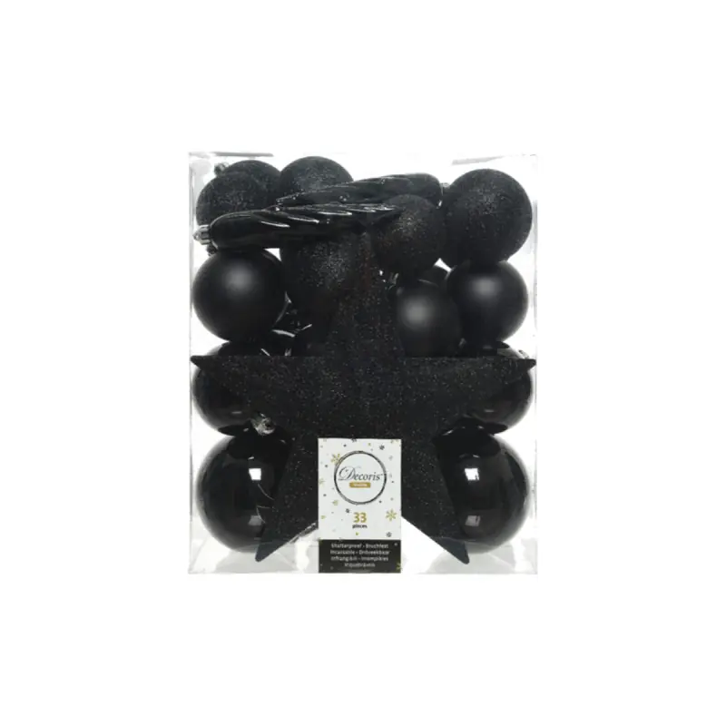 A Box of 33 EDM Christmas Accessories - Christmas Spirit - Black - 72211 ideal for decorating your Christmas tree with black. The assortment includes 1 glitter star, 4 shiny black balls of 8 cm, 6 shiny black balls of 6 cm, 6 black balls of 6 cm, 6 glitter black balls, 4 shiny black balls of 5 cm, 3 glitter black balls of 2.5 cm, and 3 shiny black icicles. This accessory set will allow your tree to be both understated and harmonious. You can enhance it all with white, red, or silver balls or garlands, for example.