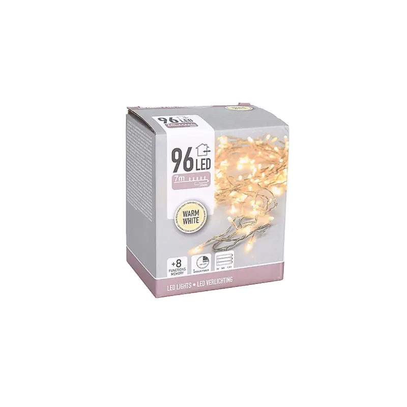 EDM Glittering Garland - Christmas Spirit - Warm White Light - 96 LED Bulbs - 7 m - 72080 decorate your Christmas tree, balcony, or fireplace with a twinkling garland! This lighting set operates on batteries and can be used indoors or outdoors thanks to its waterproof design (IP44 standard). A built-in 6-hour timer is included for responsible use, and it also features low energy consumption due to its LED technology. Make your home shine for a beautiful winter and festive atmosphere with its eight twinkling light functions!