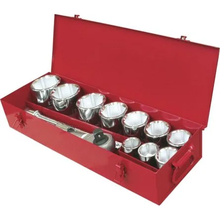 This 14-piece socket set by Ega-Master features both imperial and metric sizes with a 1 in drive and includes a ratchet.