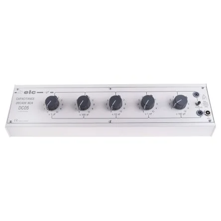 ELC Decade Capacitance BoxThe ELC 1% decade capacitance box can be adjustable via a rotary control. This box uses polystyrene and polypropylene capacitors offering high-accuracy, a low-temperature coefficient (125ppm/°c) and high-insulation resistance. This is robust, easy to install and has robust switches with metal frame and gold-plated contact.Features and BenefitsFive decades are 100pF, 1nF, 10nF, 100nF and 1µF Outputs on each decade via 4mm safety sockets Discharge pushbutton Capacitance resolution is 100pF Maximum voltage rating is 300VDC or 230VAC 50Hz until 1000Hz Length of 100mm, width of 427mm and height of 72mmCertificationsEN 61010-1 ANSI/ESD S20.20:2014 BS EN 61340-5-1:2007