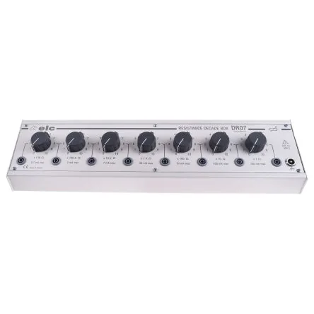 ELC Decade Resistance BoxThe ELC decade resistance box with a metal film resistors offering typical accuracy of 0.5% and a temperature coefficient of ±50 ppm/°C. It can be adjustable via a rotary control. This is a robust metal case epoxy finish, easy to install and has robust switches with metal frame and gold-plated contact.Features and BenefitsSeven decades are 1ohm, 10ohm, 100ohm, 1kohm, 10kohm, 100kohm and 1M Outputs on each decade via 4mm safety sockets Resistance resolution is 1ohm Maximum resistance measurement is 11.111Mohm Maximum power rating is 0.5W Screen outputs (front panel and case) on safety earth socket Good long-term stability Length of 305mm, width of 96mm and height of 68.5mmCertificationsEN 61010-1 CE certified ANSI/ESD S20.20:2014 BS EN 61340-5-1:2007